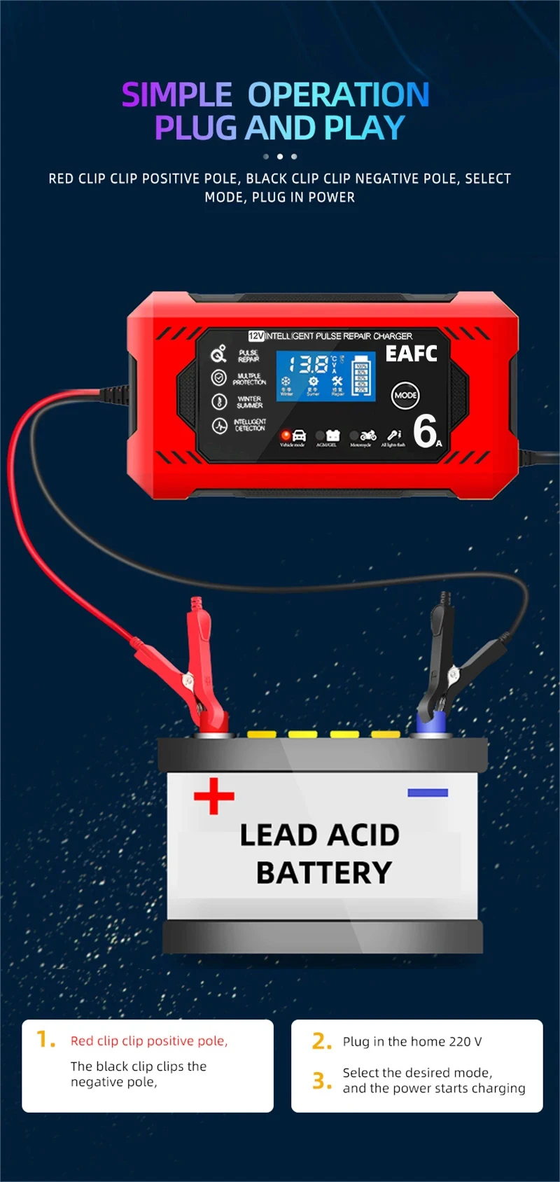 • Carga de batería de 6A :Este cargador de batería para coche y motocicleta ofrece una carga de 6A, lo que permite una carga rápida y eficiente.
