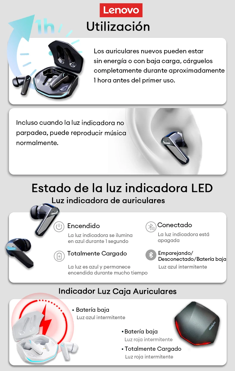 •Batería de larga duración:Con un estuche de carga, estos auriculares Lenovo GM2 Pro ofrecen una batería de larga duración, lo que garantiza que puedas disfrutar de tu música y juegos durante períodos prolongados.