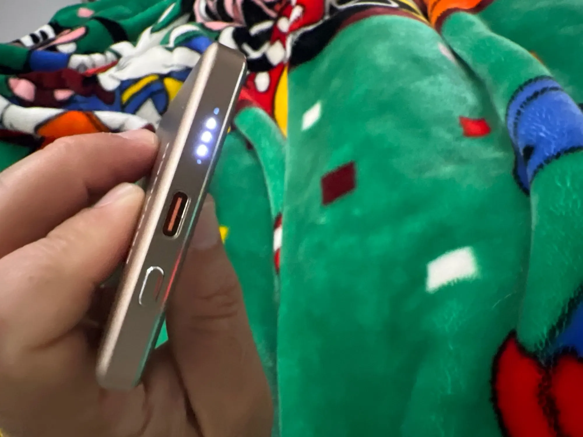 the first light bit status indicator, red (foreign objects) green (wireless output) blue (port fast charging)