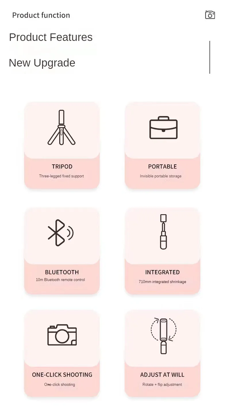1.Soporte para teléfono portátil: con su peso liviano y tamaño plegado, es muy conveniente que lo lleve porque puede guardarlo en su bolsillo o bolso.Y la longitud del estiramiento es de hasta 30”, perfecta para selfies, fotografías grupales, viajes de aventura, vlogging, transmisión en vivo, reuniones en línea y ver videos.